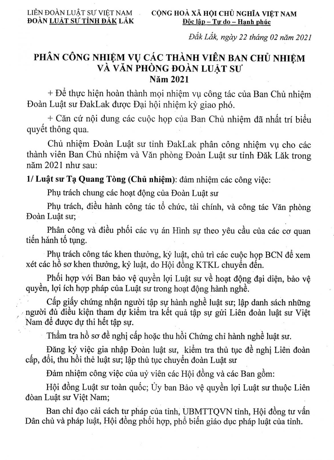 Phân công nhiệm vụ các thành viên Ban Chủ nhiệm và Văn phòng Đoàn luật sư năm 2021