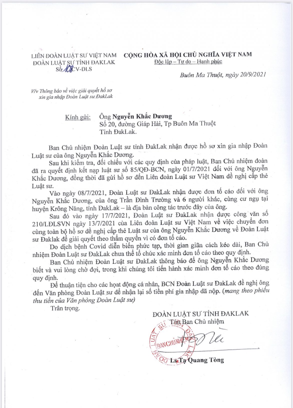 Công văn số 108/CV-ĐLS V/v Thông báo về việc giải quyết hồ sơ xin gia nhập Đoàn Luật sư Đắk Lắk