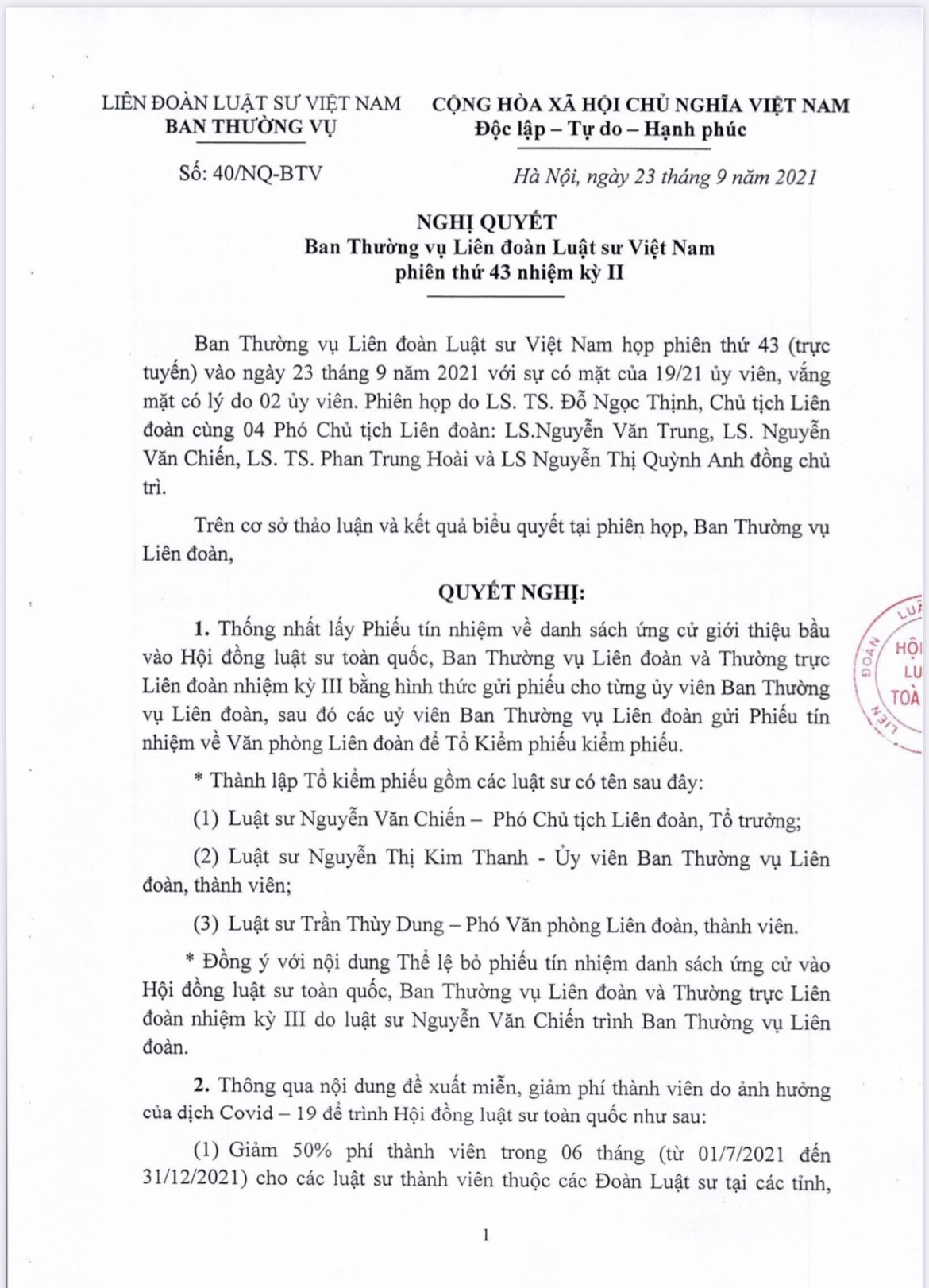 Nghị quyết số 40/NQ-BTV Ban Thường vụ Liên đoàn Luật sư Việt Nam phiên thứ 43 nhiệm kỳ II