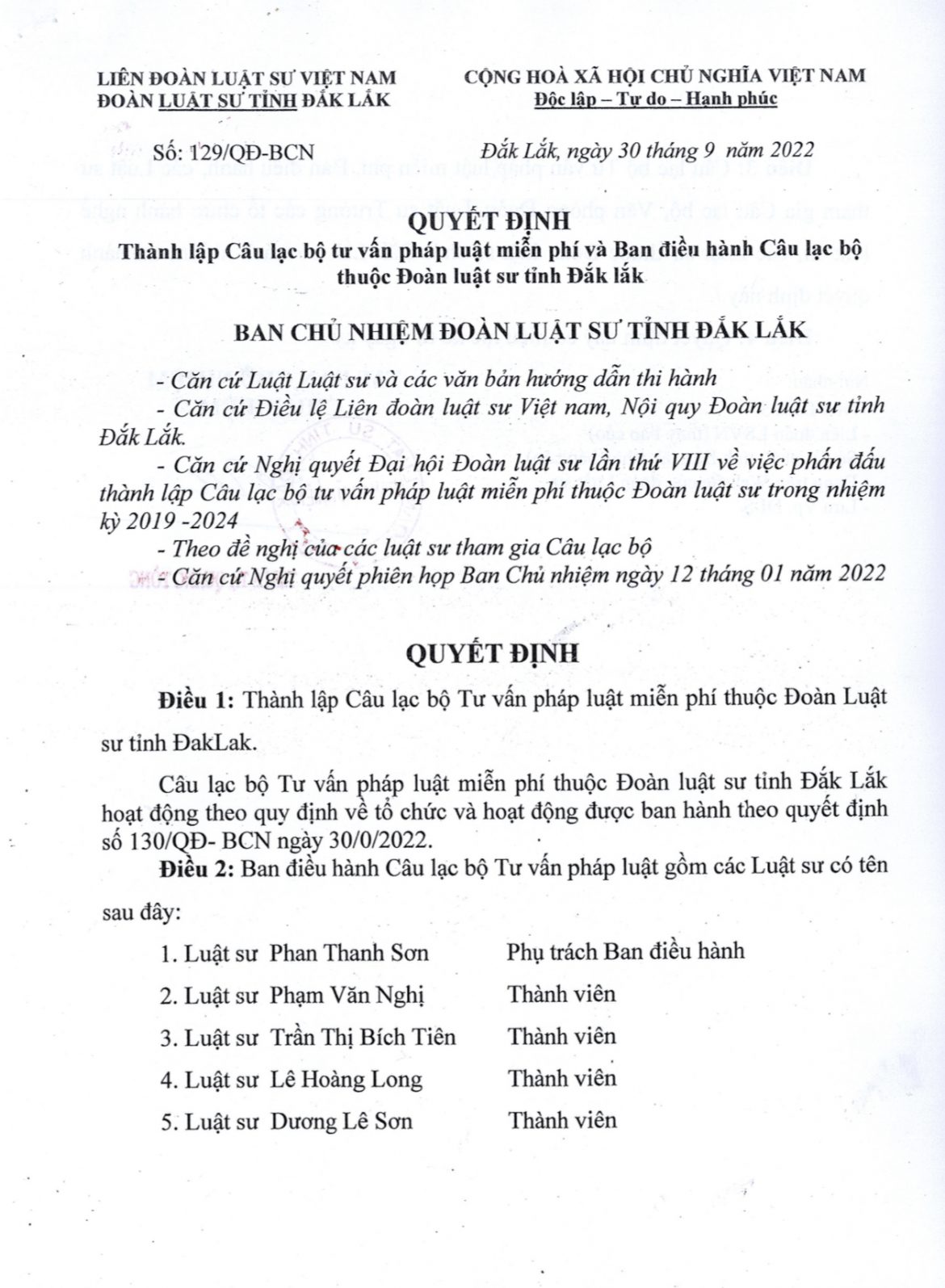 qđ-129Tải xuống 0 Bình luận lsdaklak Bài trước Văn bản số 127/2022/VB-BCN Văn bản nhắc nhở đối với Luật sư Lê Xuân Quý, Trưởng VPLS Pháp Lý Bài tiếp theo Quyết định số 130/QĐ-BCN Ban hành quy định về tổ chức, hoạt động Câu lạc bộ tư vấn pháp luật miễn phí thuộc Đoàn Luật sư tỉnh Đắk Lắk You may also like Đoàn Luật sư tỉnh Đắk Lắk họp phiên... 14 Tháng chín, 2025 Kỷ niệm 80 năm ngày truyền thống lực... 18 Tháng tám, 2025 TS.LS Đỗ Ngọc Thịnh – Chủ tịch Liên... 22 Tháng tư, 2025 Lớp bồi dưỡng chuyên môn nghiệp vụ luật... 22 Tháng tư, 2025 Thông báo số 10/BCN-ĐLS V/v gửi các văn... 8 Tháng tư, 2025 Thông báo số 39/BCN-ĐLS V/v Đăng ký tham... 8 Tháng tư, 2025 Thông báo số 45/TB-HĐKT về việc điều chỉnh... 9 Tháng mười một, 2024 Thư kêu gọi đóng góp giúp đỡ đồng... 11 Tháng chín, 2024 Thông báo số 02/TB-HĐKT về việc lùi ngày... 5 Tháng chín, 2024 Đoàn Luật sư tỉnh Đắk Lắk tham dự... 30 Tháng tám, 2024