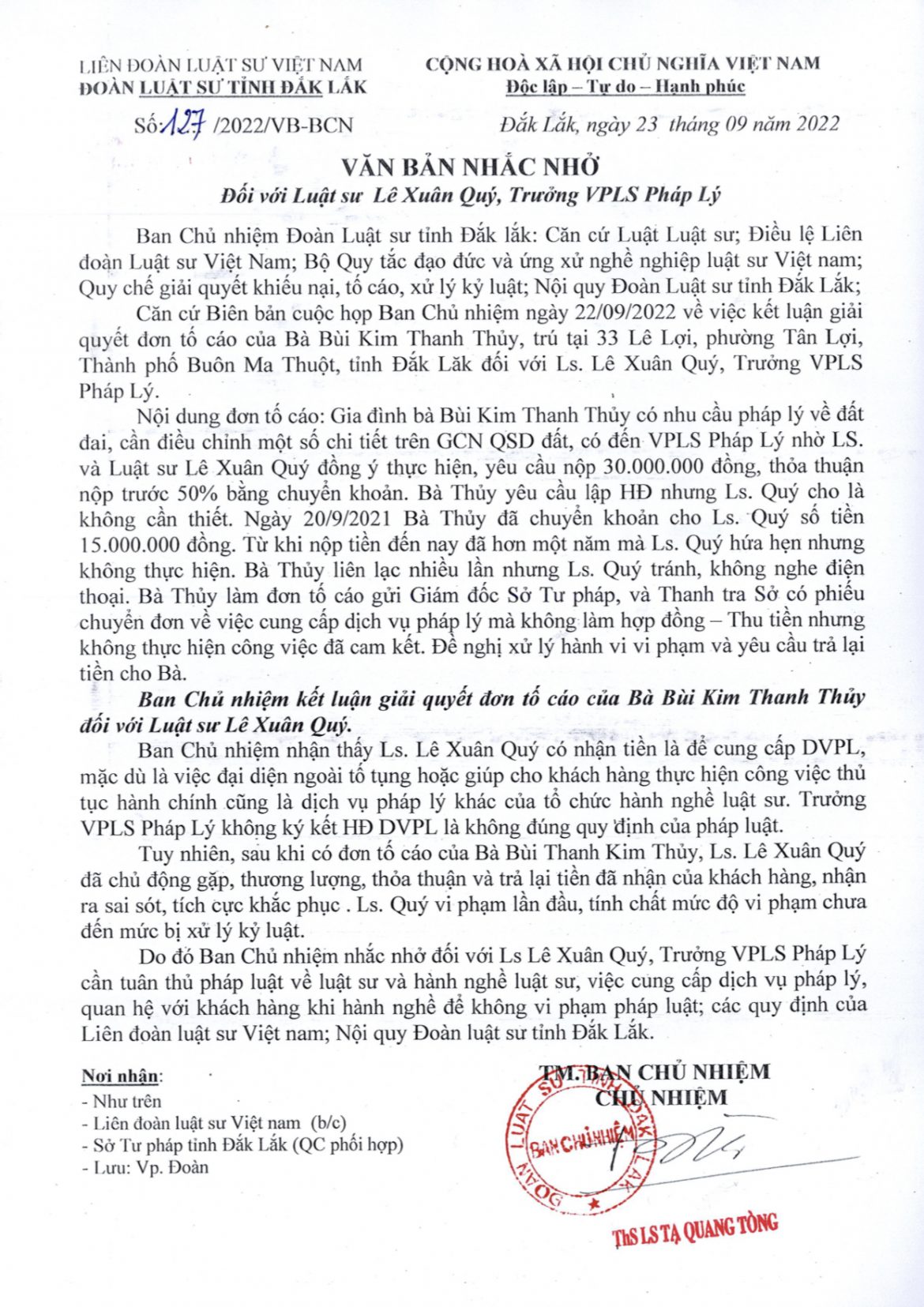 0 Bình luận lsdaklak Bài trước Văn bản số 126/2022/VB-BCN Văn bản nhắc nhở đối với Ls. Đặng Ngọc Huy, Trưởng VPLS Tín Nghĩa, Ls.Võ Ngọc Cường, Trưởng Chi nhánh VPLS Tín Nghĩa, Ls.Võ Thị Hạnh Bài tiếp theo Quyết định số 129/QĐ-BCN Thành lập Câu lạc bộ tư vấn pháp luật miễn phí và Ban điều hành Câu lạc bộ thuộc Đoàn luật sư tỉnh Đắk Lắk You may also like Đoàn Luật sư tỉnh Đắk Lắk họp phiên... 14 Tháng chín, 2025 Kỷ niệm 80 năm ngày truyền thống lực... 18 Tháng tám, 2025 TS.LS Đỗ Ngọc Thịnh – Chủ tịch Liên... 22 Tháng tư, 2025 Lớp bồi dưỡng chuyên môn nghiệp vụ luật... 22 Tháng tư, 2025 Thông báo số 10/BCN-ĐLS V/v gửi các văn... 8 Tháng tư, 2025 Thông báo số 39/BCN-ĐLS V/v Đăng ký tham... 8 Tháng tư, 2025 Thông báo số 45/TB-HĐKT về việc điều chỉnh... 9 Tháng mười một, 2024 Thư kêu gọi đóng góp giúp đỡ đồng... 11 Tháng chín, 2024 Thông báo số 02/TB-HĐKT về việc lùi ngày... 5 Tháng chín, 2024 Đoàn Luật sư tỉnh Đắk Lắk tham dự... 30 Tháng tám, 2024