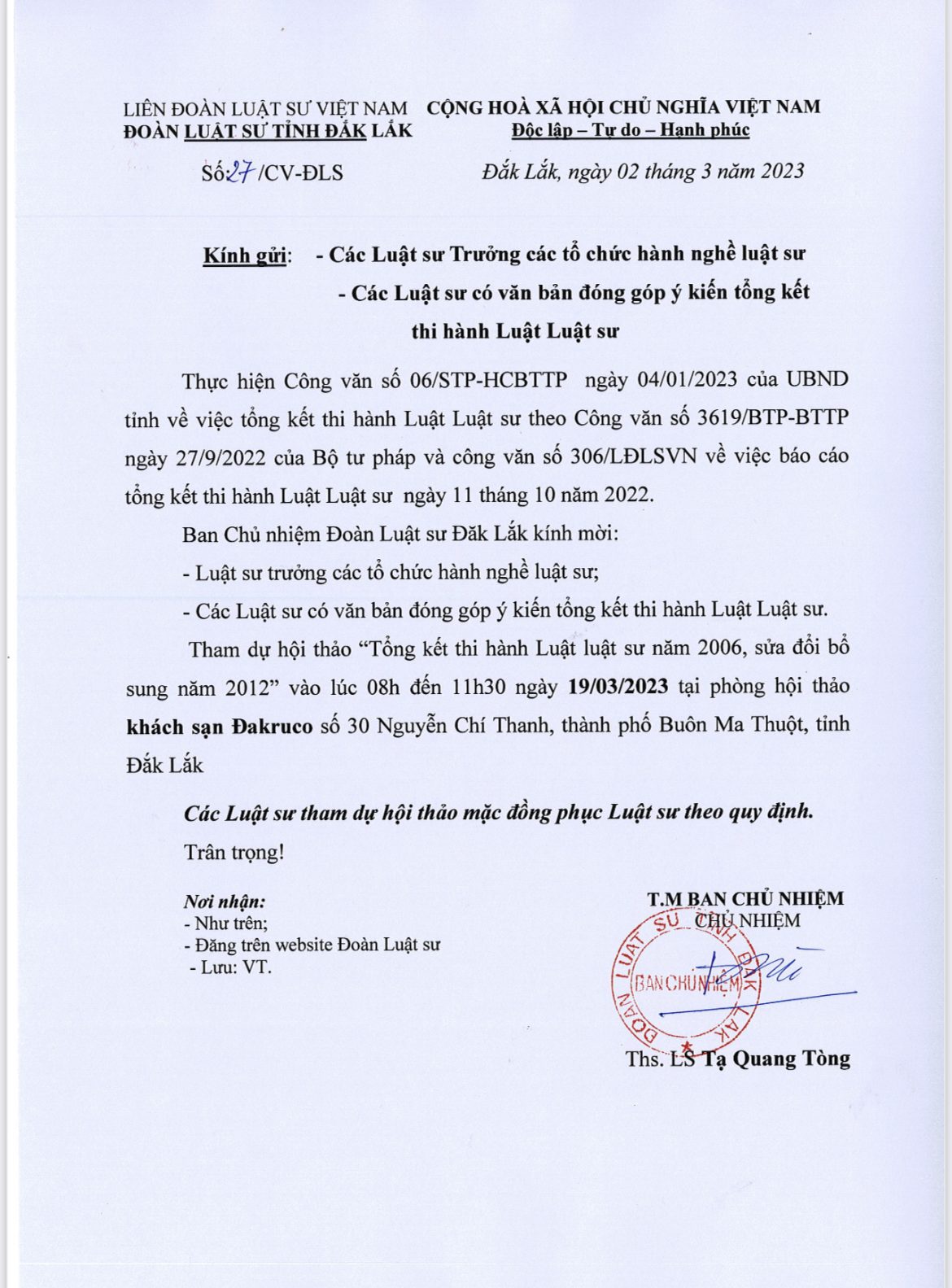 0 Bình luận lsdaklak Bài trước Tin hoạt động BCN Đoàn Luật sư Đắk Lắk Bài tiếp theo Công văn số 28/CV- ĐLS You may also like Đoàn Luật sư tỉnh Đắk Lắk họp phiên... 14 Tháng chín, 2025 Kỷ niệm 80 năm ngày truyền thống lực... 18 Tháng tám, 2025 TS.LS Đỗ Ngọc Thịnh – Chủ tịch Liên... 22 Tháng tư, 2025 Lớp bồi dưỡng chuyên môn nghiệp vụ luật... 22 Tháng tư, 2025 Thông báo số 10/BCN-ĐLS V/v gửi các văn... 8 Tháng tư, 2025 Thông báo số 39/BCN-ĐLS V/v Đăng ký tham... 8 Tháng tư, 2025 Thông báo số 45/TB-HĐKT về việc điều chỉnh... 9 Tháng mười một, 2024 Thư kêu gọi đóng góp giúp đỡ đồng... 11 Tháng chín, 2024 Thông báo số 02/TB-HĐKT về việc lùi ngày... 5 Tháng chín, 2024 Đoàn Luật sư tỉnh Đắk Lắk tham dự... 30 Tháng tám, 2024