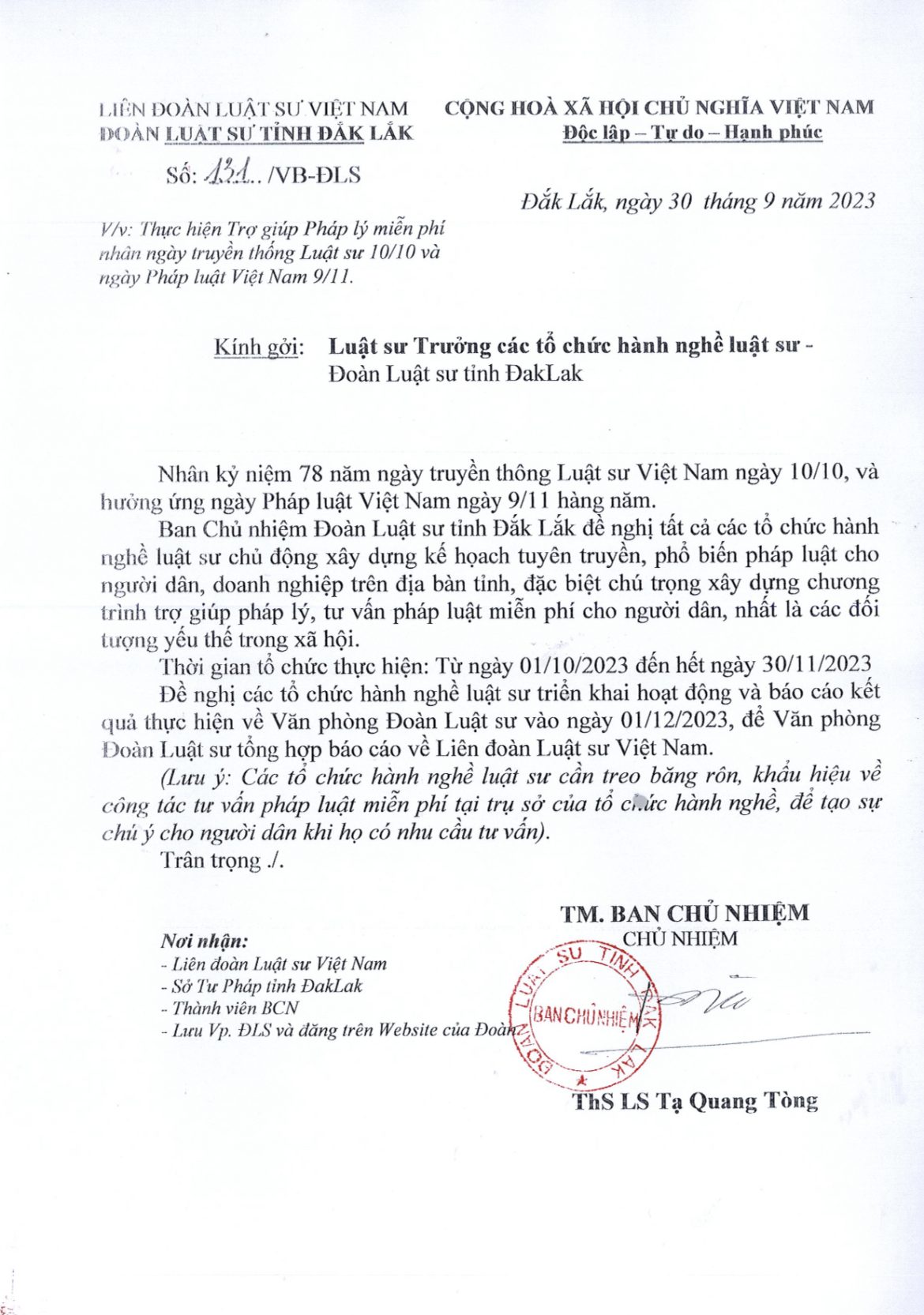 Văn bản số 131/VB-ĐLS V/v thực hiện Trợ giúp Pháp lý miễn phí nhân ngày truyền thống Luật sư 10/10 và ngày Pháp luật Việt Nam 9/11