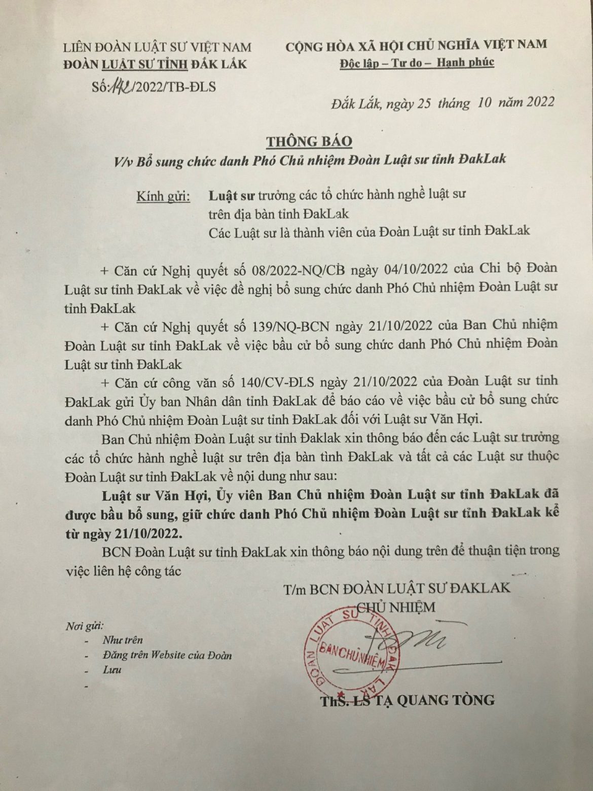 0 Bình luận lsdaklak Bài trước Đoàn Luật sư tỉnh Đắk Lắk: Chào mừng kỷ niệm 77 năm ngày truyền thống Luật sư Việt Nam (10/10/1945 – 10/10/2022) Bài tiếp theo Thông báo số 01/TB-HĐKT Về việc tổ chức Kỳ kiểm tra kết quả tập sự hành nghề luật sư đợt 1 năm 2023 You may also like Đoàn Luật sư tỉnh Đắk Lắk họp phiên... 14 Tháng chín, 2025 Kỷ niệm 80 năm ngày truyền thống lực... 18 Tháng tám, 2025 TS.LS Đỗ Ngọc Thịnh – Chủ tịch Liên... 22 Tháng tư, 2025 Lớp bồi dưỡng chuyên môn nghiệp vụ luật... 22 Tháng tư, 2025 Thông báo số 10/BCN-ĐLS V/v gửi các văn... 8 Tháng tư, 2025 Thông báo số 39/BCN-ĐLS V/v Đăng ký tham... 8 Tháng tư, 2025 Thông báo số 45/TB-HĐKT về việc điều chỉnh... 9 Tháng mười một, 2024 Thư kêu gọi đóng góp giúp đỡ đồng... 11 Tháng chín, 2024 Thông báo số 02/TB-HĐKT về việc lùi ngày... 5 Tháng chín, 2024 Đoàn Luật sư tỉnh Đắk Lắk tham dự... 30 Tháng tám, 2024