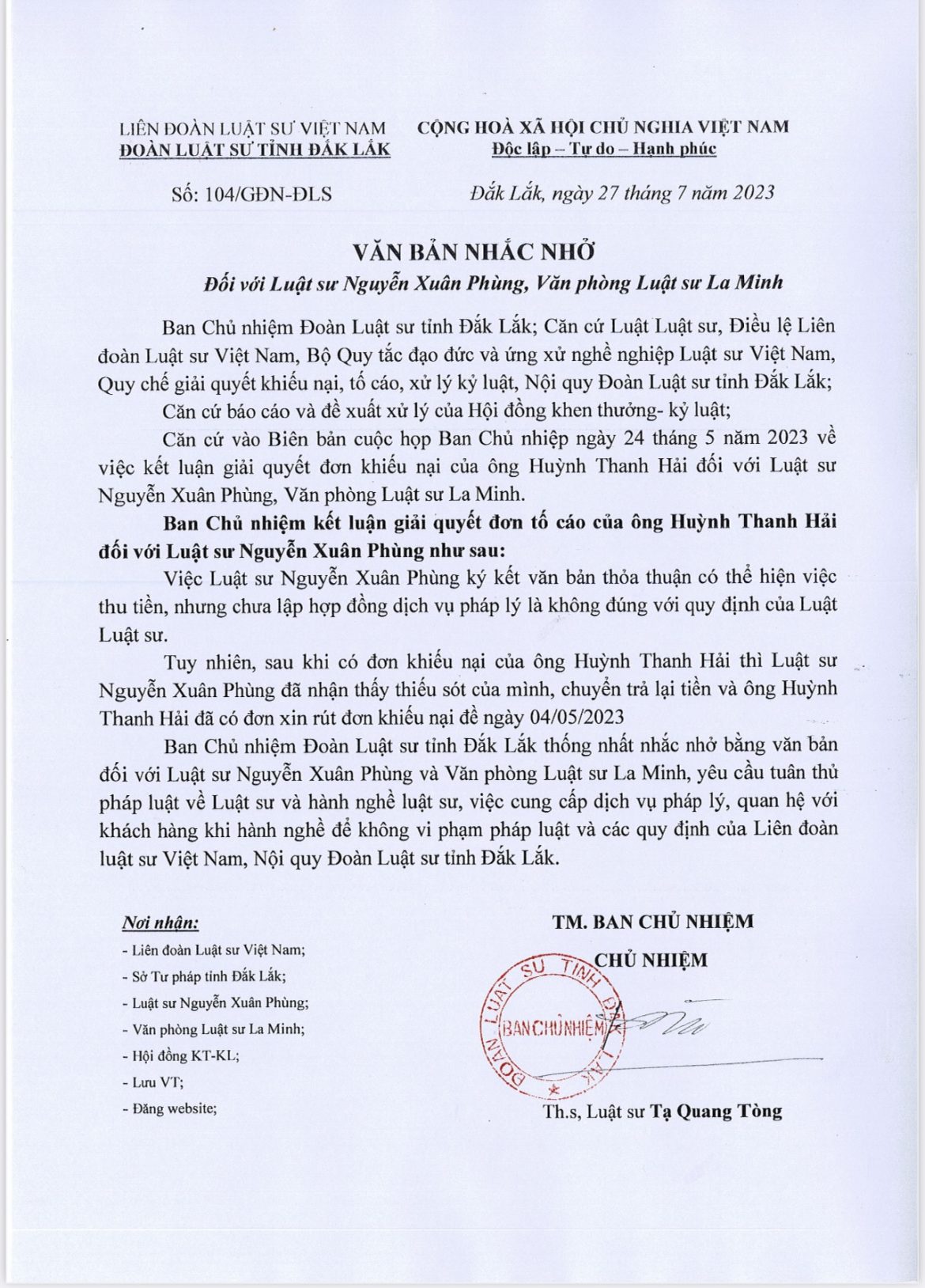 0 Bình luận admin-se Bài trước Quyết định số 109/QĐ-BCN Tạm đình chỉ tư cách thành viên đối với Luật sư Nguyễn Ngọc Bảo Chi Bài tiếp theo Tin hoạt động của Đoàn Luật sư Đắk Lắk . You may also like Đoàn Luật sư tỉnh Đắk Lắk họp phiên... 14 Tháng chín, 2025 Kỷ niệm 80 năm ngày truyền thống lực... 18 Tháng tám, 2025 TS.LS Đỗ Ngọc Thịnh – Chủ tịch Liên... 22 Tháng tư, 2025 Lớp bồi dưỡng chuyên môn nghiệp vụ luật... 22 Tháng tư, 2025 Thông báo số 10/BCN-ĐLS V/v gửi các văn... 8 Tháng tư, 2025 Thông báo số 39/BCN-ĐLS V/v Đăng ký tham... 8 Tháng tư, 2025 Thông báo số 45/TB-HĐKT về việc điều chỉnh... 9 Tháng mười một, 2024 Thư kêu gọi đóng góp giúp đỡ đồng... 11 Tháng chín, 2024 Thông báo số 02/TB-HĐKT về việc lùi ngày... 5 Tháng chín, 2024 Đoàn Luật sư tỉnh Đắk Lắk tham dự... 30 Tháng tám, 2024